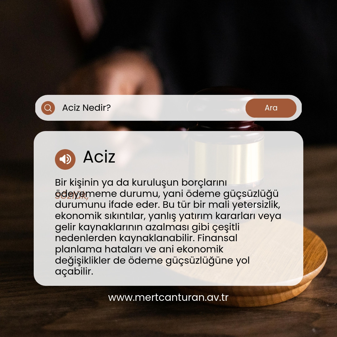 Aciz, ödeme güçsüzlüğünü ifade eden bir terimdir. Bir borçlunun vadesi gelmiş olan borçlarını ödeyememesi durumunu tarif eder. Bu durum, kişinin mal varlığının mevcut borçlarını karşılayacak düzeyde olmaması anlamına gelir. Aciz hali, finansal olarak zor durumda olan bireyler veya işletmeler için kullanılan bir tanımdır ve genellikle iflasın öncesinde ortaya çıkar.