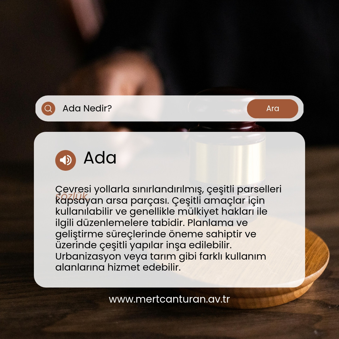 Ada, çevresi yollarla sınırlandırılmış ve çeşitli parselleri kapsayan bir arsa parçasıdır. Bu alan, genellikle belirli bir yerleşim düzeni içinde bulunur ve sınırları net bir şekilde tanımlanmış olan bölgelerdir. Ada, şehir planlamasında önemli bir rol oynar, çünkü bu yapı şehirlerin organize edilmesini ve altyapının verimli bir şekilde kullanılmasını sağlar.