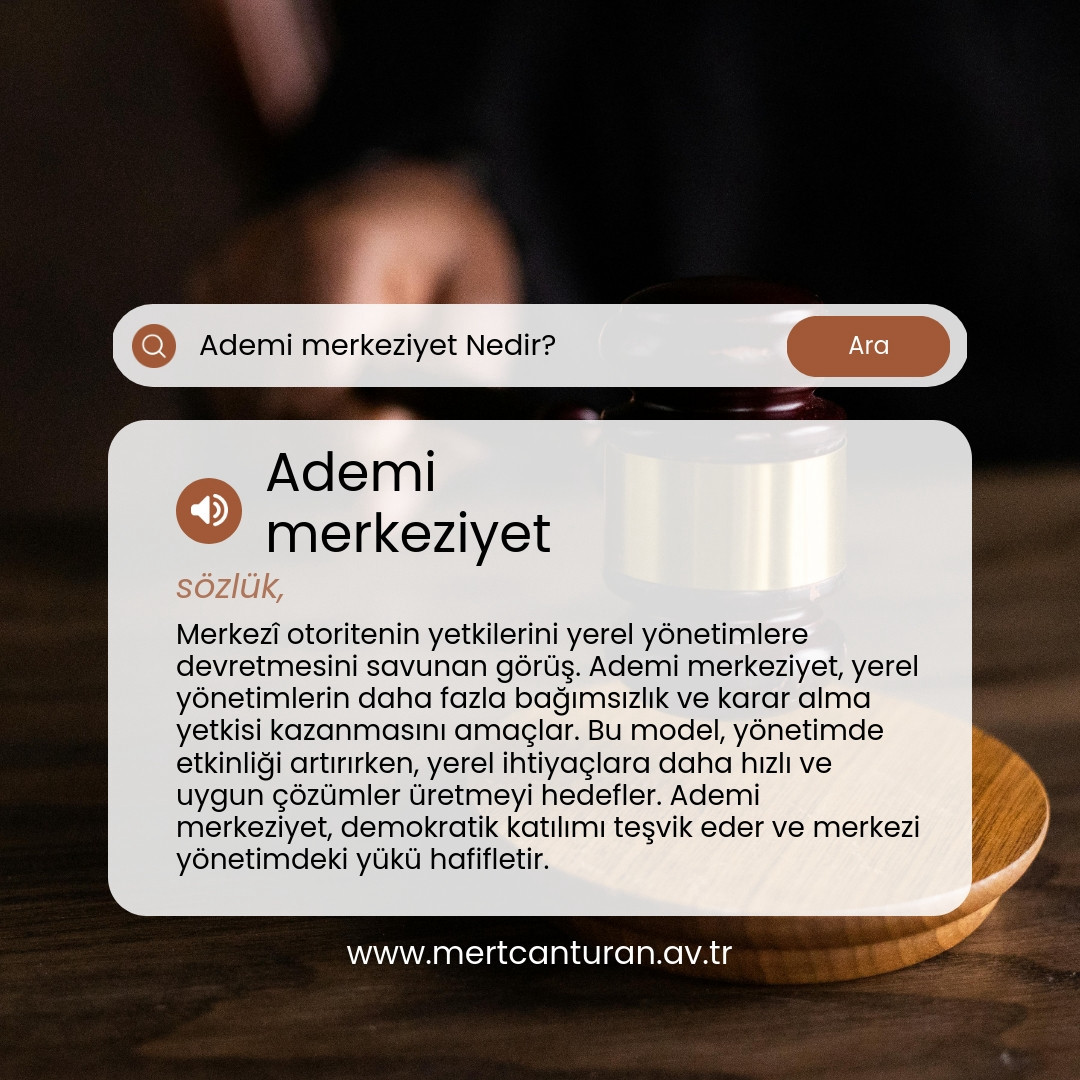 Ademi merkeziyet, merkezî otoritenin yetkilerini yerel yönetimlere devretmesini savunan bir görüştür. Bu görüş, yerel yönetimlerin kendi bölgelerinde daha fazla yetki ve sorumluluk sahibi olmasını hedefler. Ademi merkeziyetçilik, merkezi otoritenin yükünü azaltarak yerel yönetimlerin daha etkin ve verimli çalışmasını sağlar.