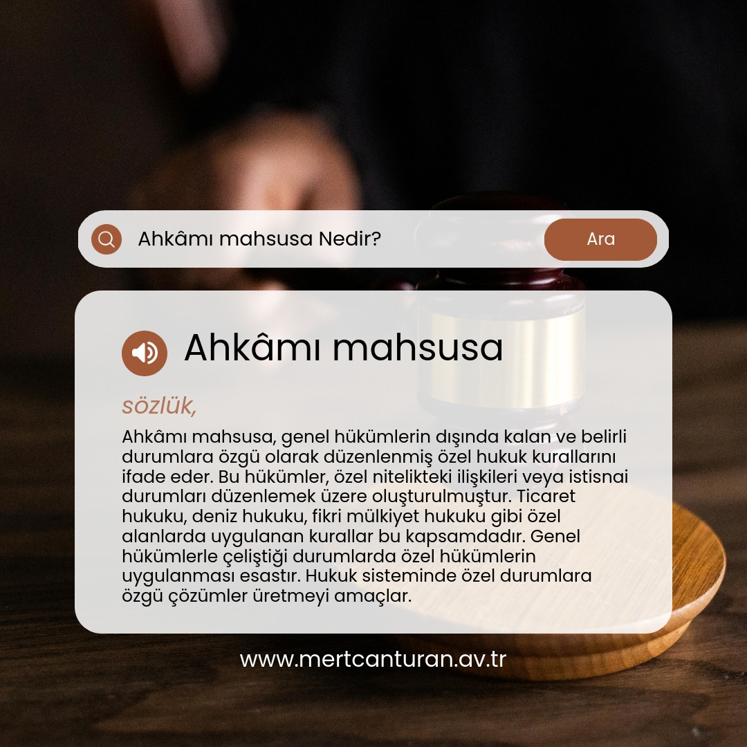 Ahkâmı mahsusa, özel hükümler anlamına gelir ve belirli durumlar veya konular için geçerli olan spesifik düzenlemeleri ifade eder. Bu hükümler, genel kuralların dışında kalan özel şartları ve istisnaları düzenler.