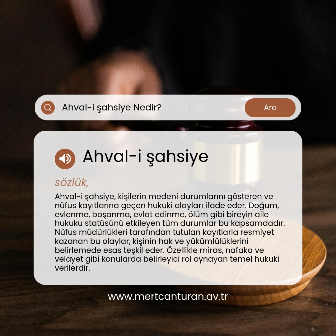 Ahval-i şahsiye, kişisel durumları ifade eden ve doğum, evlenme, boşanma, evlat edinme, ölüm gibi hukuki durumları kapsayan bir terimdir. Bu kavram, bireylerin aile ve medeni hukukla ilgili temel yaşam olaylarını belgeleyen resmi kayıtları içerir.