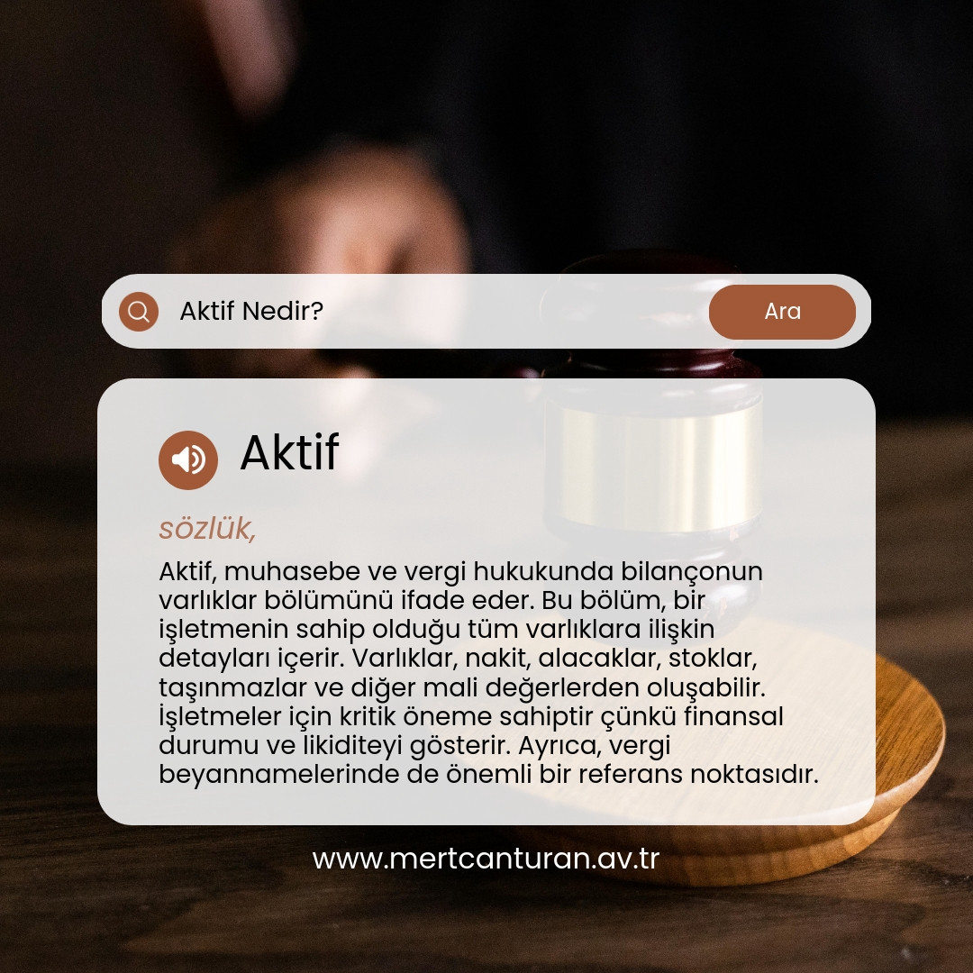 Aktif, muhasebe ve vergi hukukunda bilançonun varlıklar bölümünü ifade eder. Bilançonun bu bölümü, işletmenin sahip olduğu tüm varlıkları gösterir ve finansal durumu değerlendirmek için kritik bir öneme sahiptir. Varlıklar, genellikle dönen ve duran varlıklar olmak üzere iki ana kategoriye ayrılır.