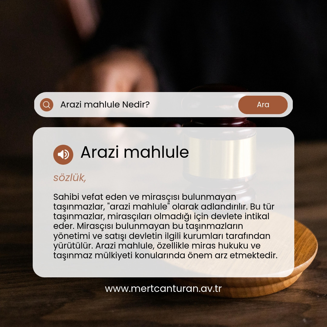 Arazi mahlule, sahibinin vefatı sonrasında mirasçısı bulunmayan taşınmazlardır. Bu tür mülkler, malikin ölümünden sonra herhangi bir yasal mirasçı olmadığı durumlarda ortaya çıkar ve genellikle devlete geçer. Mirasçısız taşınmazlar kavramı, mülkiyet haklarının korunması ve yönetimi açısından önem arz eder. Arazi mahluleler, devlet tarafından değerlendirilerek kamu yararına kullanılabilir veya yeniden vatandaşlara tahsis edilebilir.