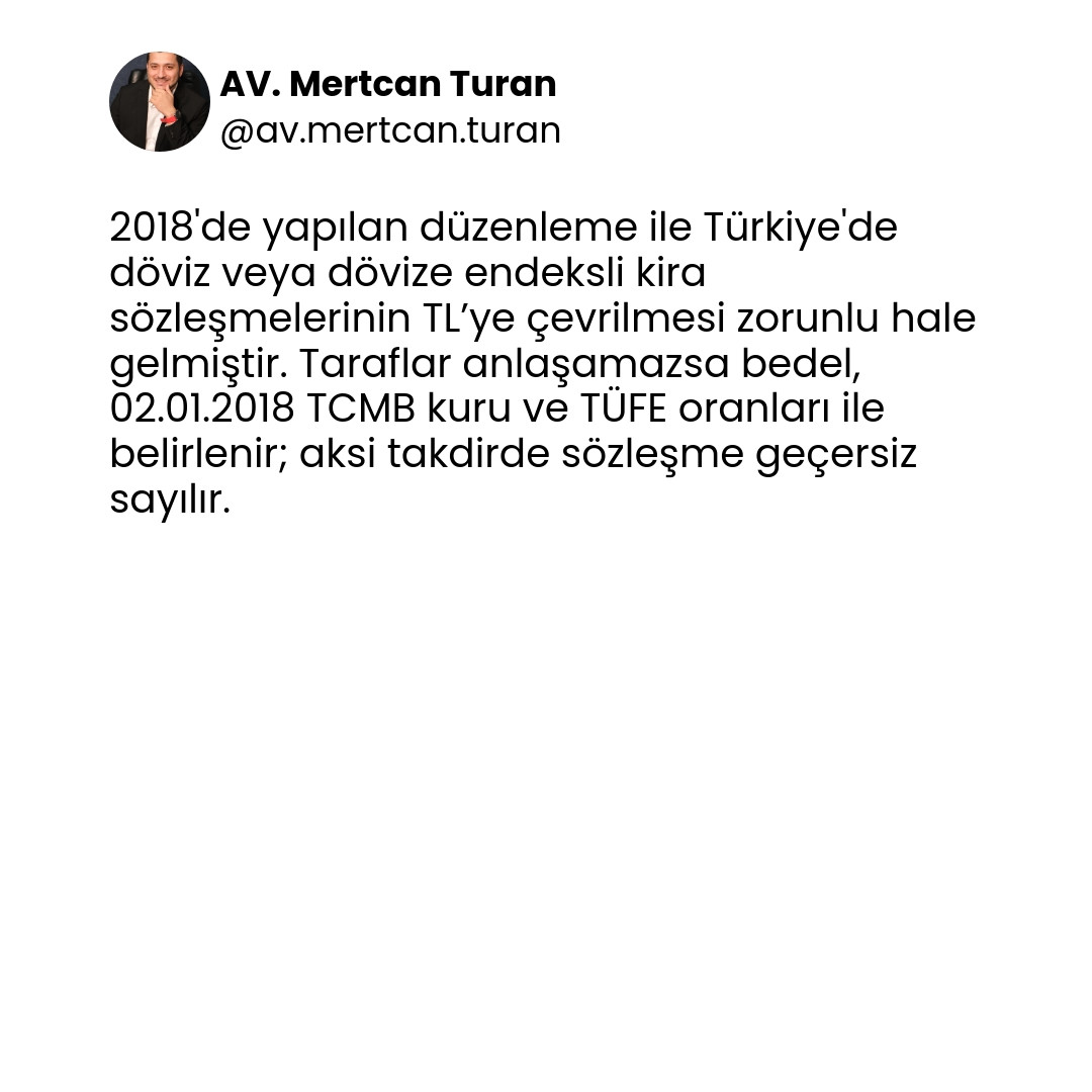 - Türkiye’de yerleşik kişiler arasındaki kira sözleşmelerinin döviz cinsinden veya dövize endeksli olması durumunda, TL’ye çevrilmesi zorunludur.