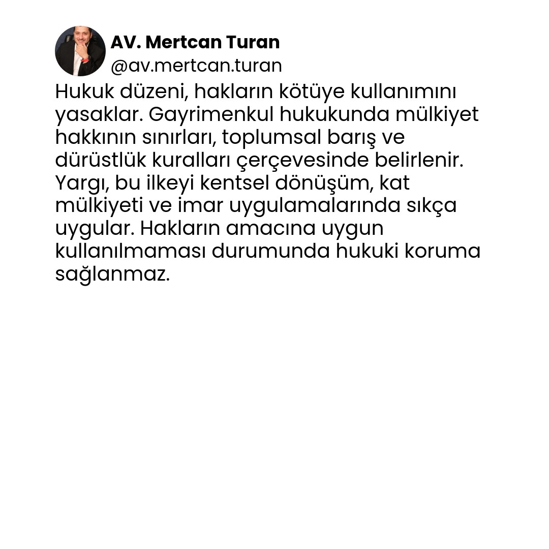 Gayrimenkul hukukunda hakların kullanımı, dürüstlük kuralı ve toplumsal yarar çerçevesinde olmalıdır. Aksi halde, hukuken geçerli görünen talepler dahi korunmaz. Uygulamada bu dengeyi sağlamak için: