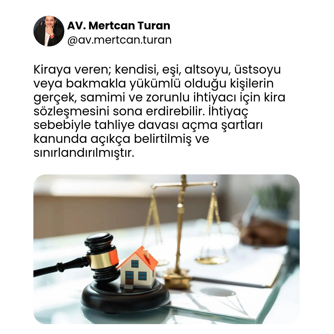 • İhtiyaç; kiraya verenin eşi, çocukları, ebeveynleri veya bakmakla yükümlü olduğu kişiler için olmalıdır.