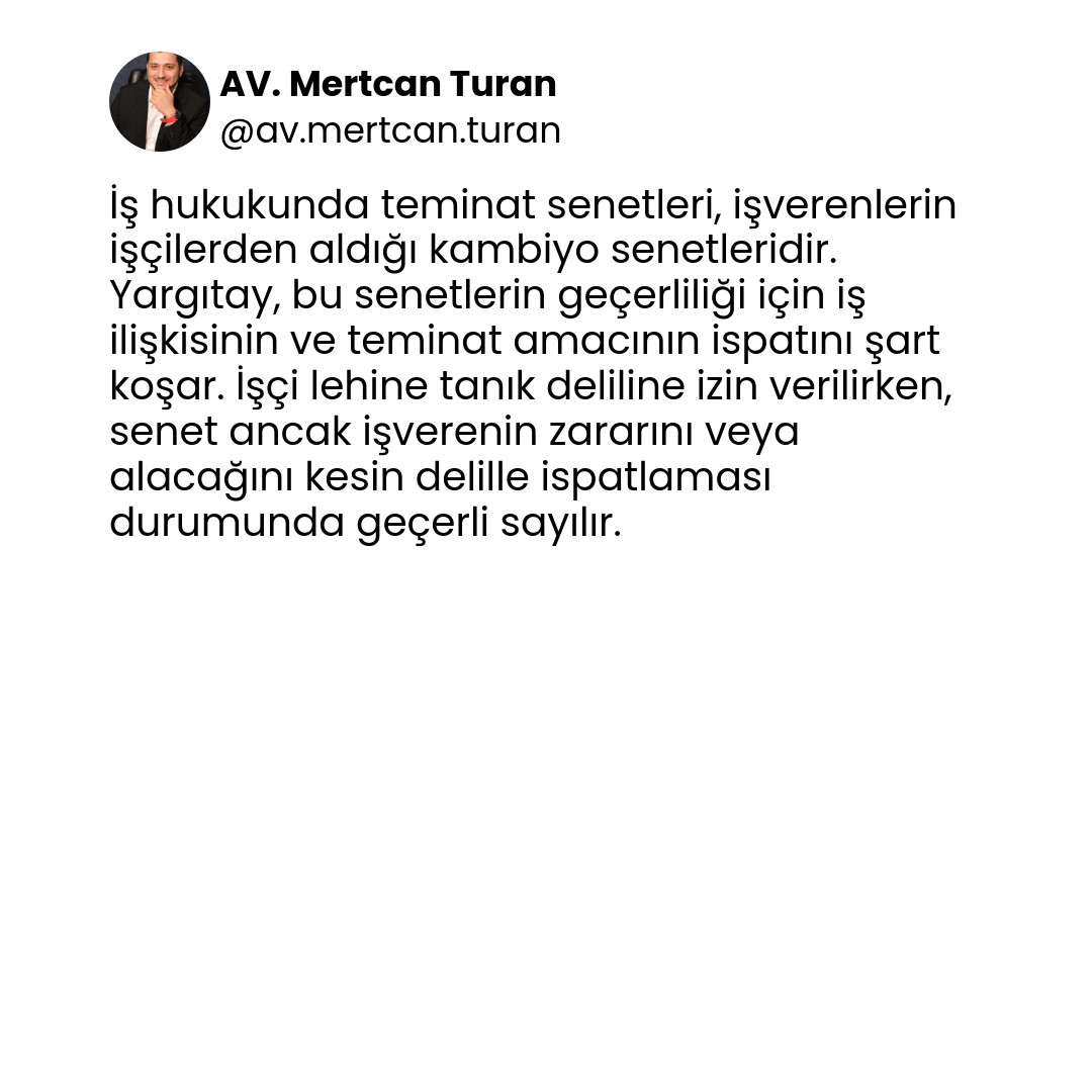 Teminat senetleri, işverenlerin işçilerden aldığı ve belirli şartlara bağlı olarak geçerli sayılan kambiyo senetleridir. Yargıtay, bu senetlerin geçerliliği için iş ilişkisinin ve teminat amacının ispatını aramaktadır. İşçi lehine esnek delil kuralları uygulanırken, işverenin zararını kanıtlaması da şarttır.