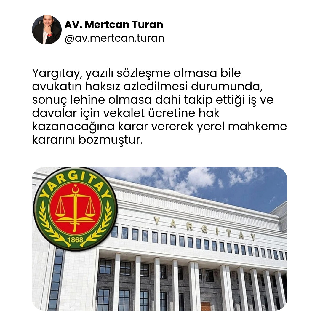 Anahtar Kelimeler: Avukatlık ücreti, vekalet ilişkisi, Yargıtay kararı, haksız azil, icra takibi, Avukatlık Kanunu